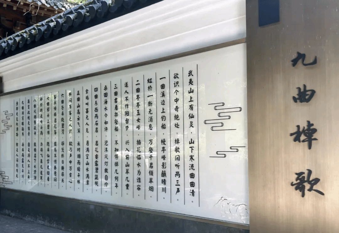 实践队首站抵达武夷宫内的武夷春秋馆,了解武夷山的风情地貌及武夷九曲图。馆中关于武夷山的详细介绍让大家了解到这片钟灵毓秀的土地如何孕育出博大精深的朱子文化。墙上悬挂的历代文人墨客咏叹武夷山的诗词,字里行间都透着对这片山水与文化的敬仰。其中,朱熹的九曲棹歌更是让实践队深切感受到他对武夷山的深厚情感。在这里,大家通过实物展品和图文资料全方位认识了武夷山的自然与人文交融之美,为后续探寻朱子文化奠定了坚实基础。