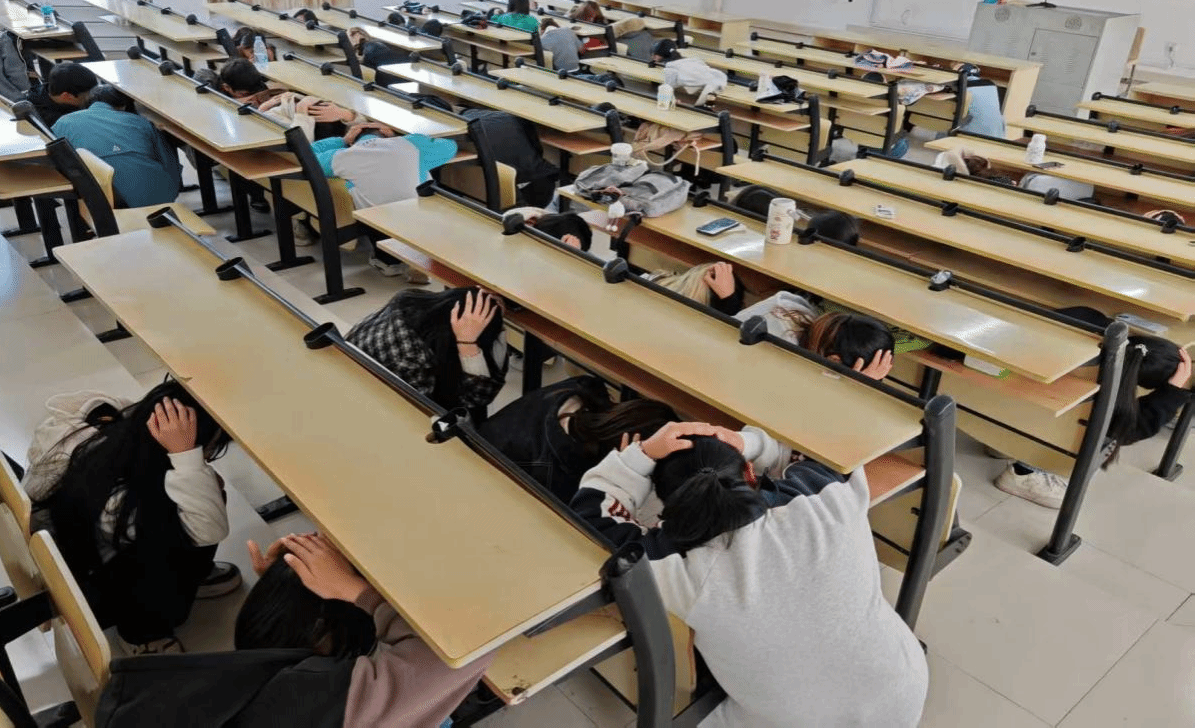 随着警报声响起,全体学生迅速反应,沉着冷静地就近躲避。大家双手抱头、弯腰低身,迅速蜷缩至课桌下方或墙角等安全区域。随后,在老师和现场工作人员的引导下,学生们按照预定疏散路线,快速、有序地撤离至操场安全区域。整个疏散过程紧张有序、行动迅速,充分展现了师生良好的应急反应能力和协作配合精神。